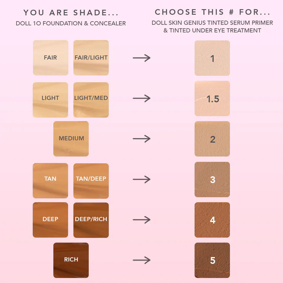 A tinted primer that does it all! This revolutionary Doll Skin Genius Tinted Serum Primer preps skin for makeup, blurs texture, minimizes pores, and provides instant light coverage - all while energizing your skin cells to repair and defend against aggressors.??