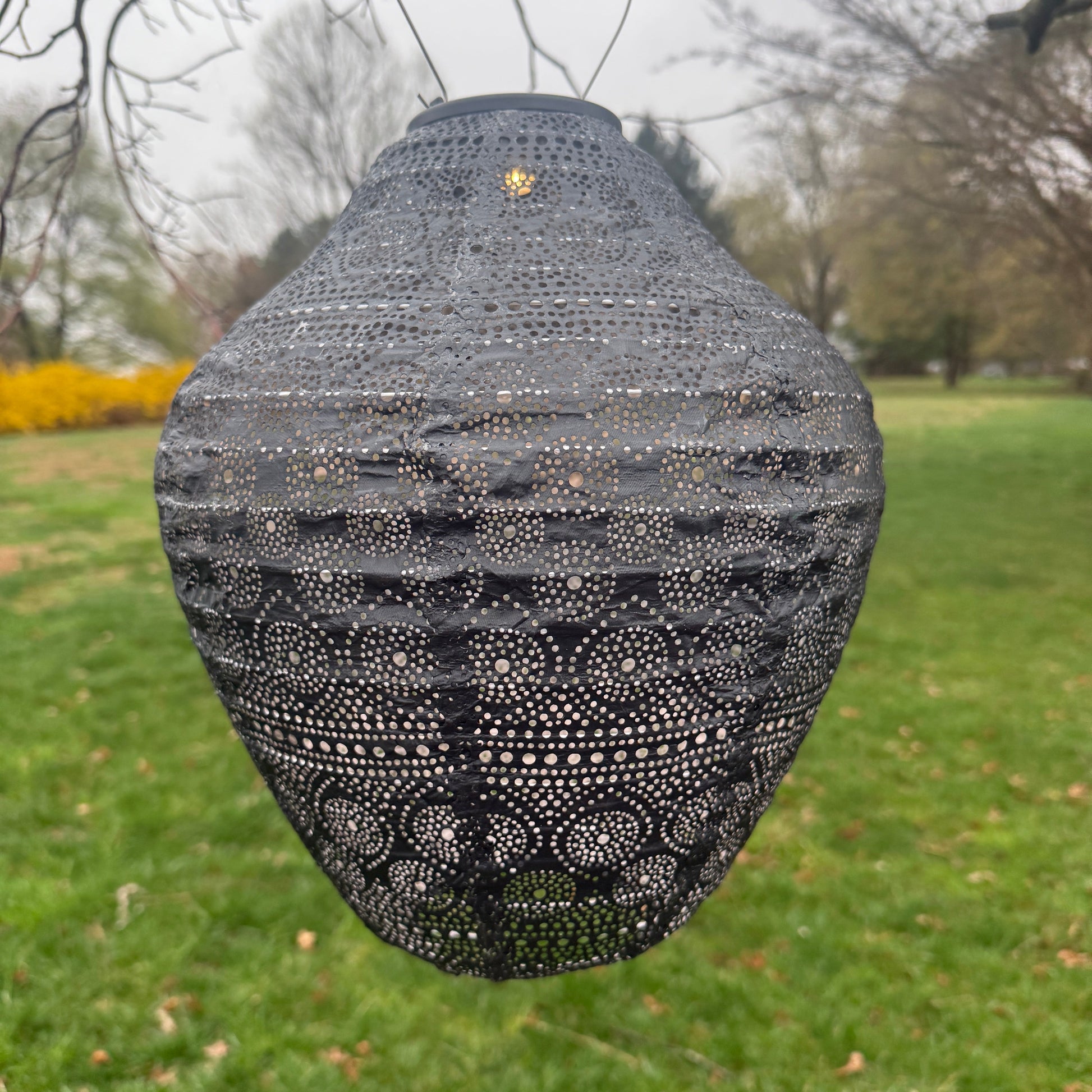It is a unique lantern that not only is beautiful on its own but allows the light to cast an enchanting design on all surrounding surfaces.